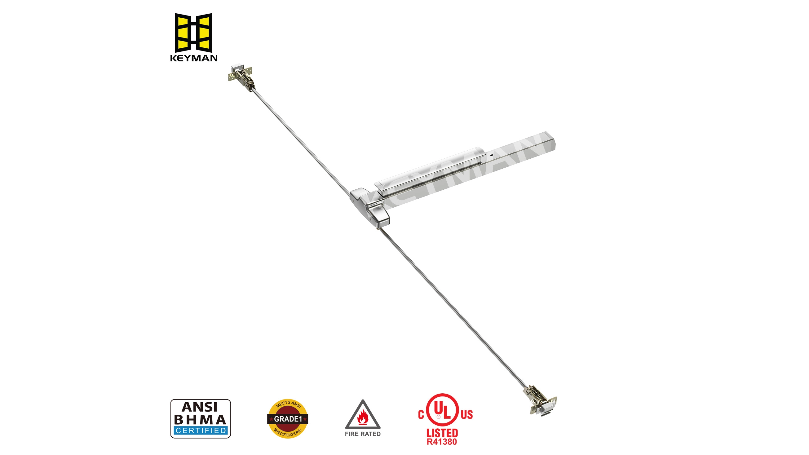 · القضبان العمودية (السطحية أو المخفية): بالنسبة للأبواب المزدوجة، غالبًا ما تستخدم أجهزة القضبان العمودية. تحتوي هذه على قضبان تمتد لأعلى ولأسفل على طول الباب، إما على السطح أو مخفية داخل الباب نفسه. عند الضغط على قضيب الدفع، تقوم القضبان بسحب المسامير من أعلى وأسفل إطار الباب، مما يسمح بفتح كلا البابين.