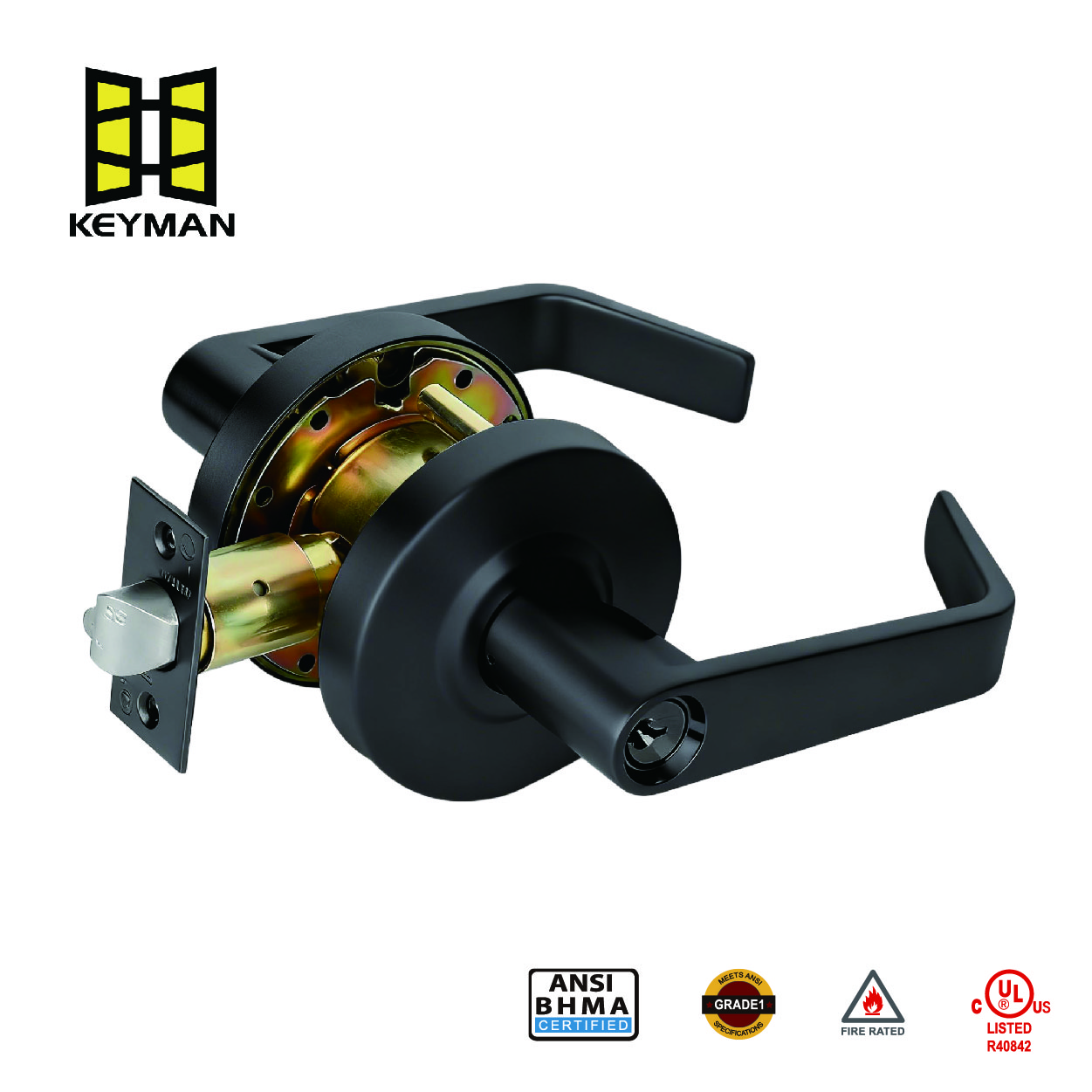 الميزة المهمة هي تصنيف UL للحريق لمدة 3 ساعات ، والذي يشهد أن مجموعة القفل يمكن أن تحافظ على سلامتها وتساعد على احتواء الحريق والدخان لمدة تصل إلى ثلاث ساعات عند تركيبها على باب مقاوم للحريق، مما يدعم الامتثال لقوانين سلامة البناء. لا يعد الأنيق اللون الأسود ممتعًا من الناحية الجمالية فحسب، بل يوفر أيضًا مقاومة معززة للتآكل والتآكل وبصمات الأصابع.